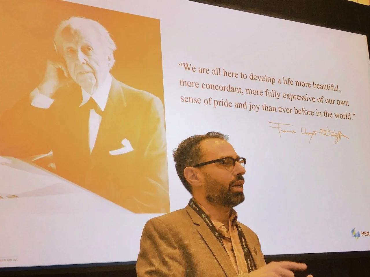 Jeff Goodman presenting at Hexagon LIVE (2019) about the successful collaboration between Leica Geosystems and the Frank Lloyd Wright Foundation to launch the BLK360—showcasing how strategic partnerships drive both business and cultural impact.